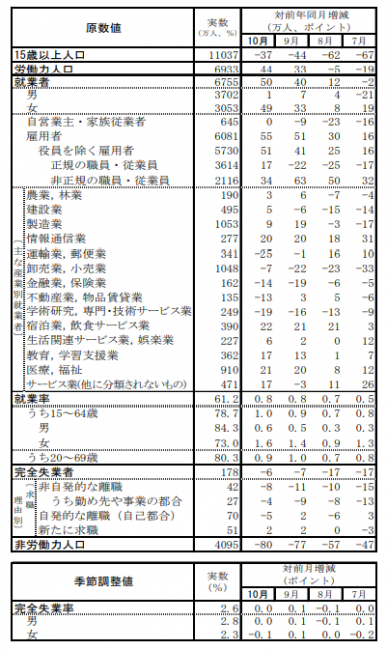 総務省統計局が10月の「労働力調査」を発表した。就業者数6755万人で、前年同月に比べ50万人増加し、3カ月連続で増加となった。