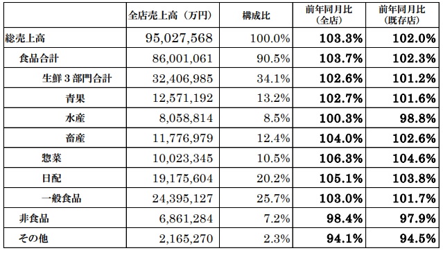 食品合計は8600億1061万円で既存店102.3%。生鮮3部門合計は、3240億6985万円で101.2%だった。