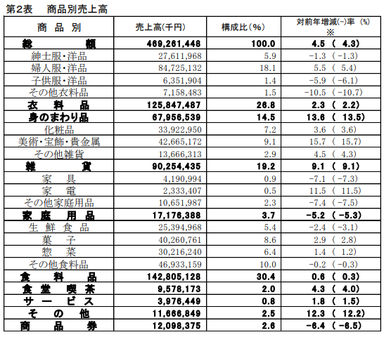 商品別では、主要5品目のうち、衣料品・身のまわり品・雑貨・食料品の4品目で前年実績を超えた。