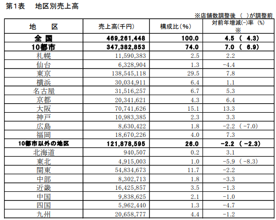 地区別では、10大都市が7.0%増で14カ月連続で伸長した。一方、10都市以外の地方では2.2%減で、北海道以外の7地区で前年割れ。8カ月ぶりにマイナスに転じた。