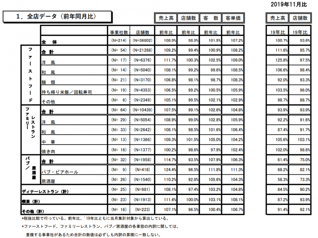 11月外食統計|前年同月比108.9%・19年比100.7%/一部業態でW杯需要