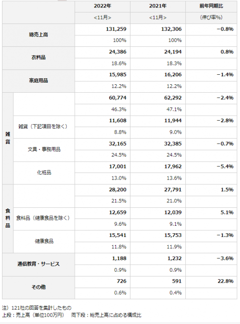 11月度の総売上高(121社)は1312億5900万円で、前年同月比0.8%減少した。