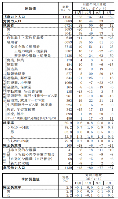 総務省統計局が11月の「労働力調査」を発表した。就業者数6724万人で、前年同月に比べ28万人増加し、4カ月連続で増加となった。