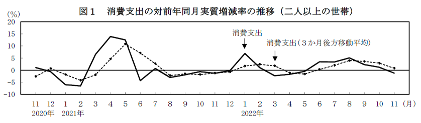 総務省統計局発表の11月の「家計調査報告」によれば、2人以上の世帯の消費支出は28万5947円で、前年同月比は物価変動の影響を除いた実質では1.2%の減少、名目3.2%の増加となった。前月比(季節調整値) は実質0.9%の減少だった。