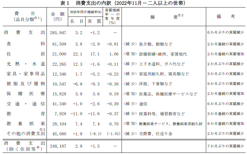 11月家計調査|2人以上世帯消費支出は28.6万円1.2%減/実収入0.3%減
