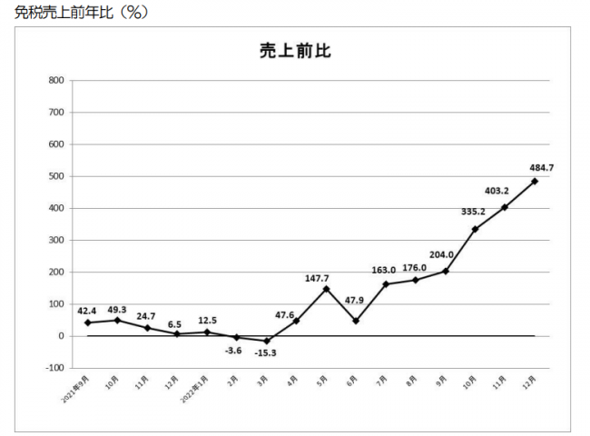 12月の免税総売上高は約214億5000万円で、前年同月比は484.7%増加した。売上高の内訳は、一般物品が約192億9000万円(507.3%増)、消耗品売上高が約21億6000万円(338.9%増)となっている。