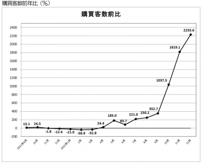 また購買客数は約19万人で前年同期比2233.6%増。一人当たりの購買単価は約11万0000円(74.9%減)で減少している。