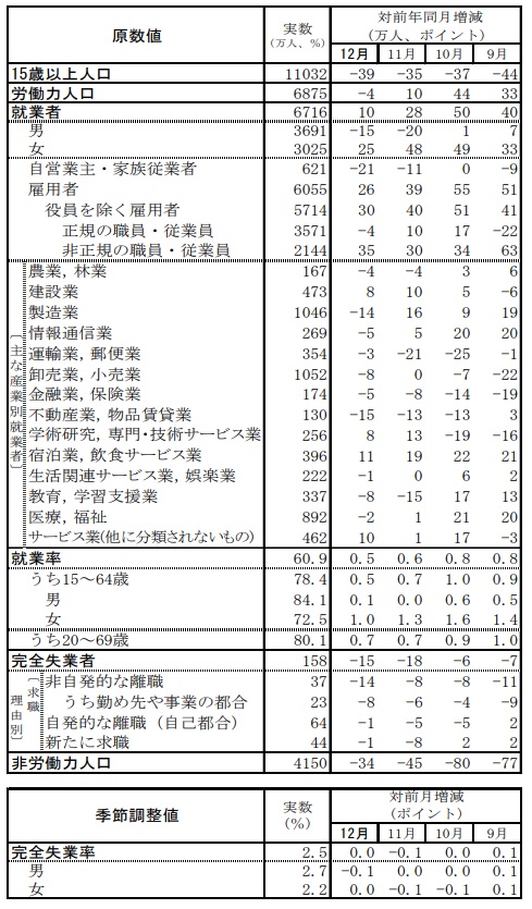 総務省統計局が12月の「労働力調査」を発表した。就業者数6716万人で、前年同月に比べ10万人増加し、5カ月連続で増加となった。