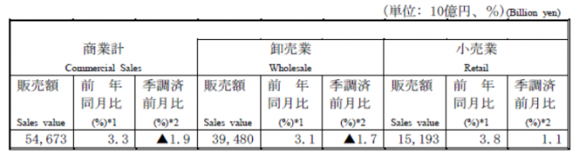 また商業販売額の季節調整済前月比は1.9%の低下となった。卸売業は同1.7%の低下、小売業は同1.1%の上昇だった。