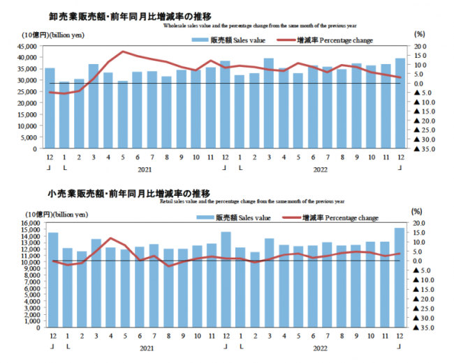 12月の商業販売額は54兆6730億円で、前年同月比3.3%増となった。内訳は卸売業が39兆4800億円(3.1%増)。小売業は15兆1930億円(3.8%増)。