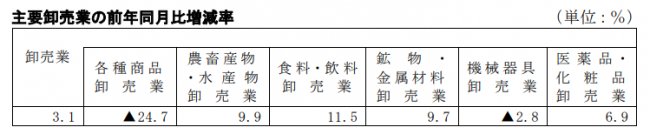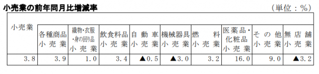 小売業を業種別にみると、医薬品・化粧品小売業が16.0%増、その他小売業が9.0%増、各種商品小売業(百貨店など)が3.9%増、飲食料品小売業が3.4%増、燃料小売業が3.2%増、織物・衣服・身の回り品小売業が1.0%増。一方で、無店舗小売業が3.2%減、機械器具小売業が3.0%減、自動車小売業が0.5%減となった。