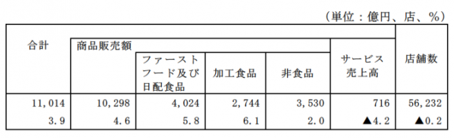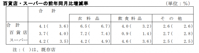 既存店は、百貨店が4.0%増、スーパーは3.5%増。商品別では、衣料品が6.7%増、飲食料品は3.2%増となった。