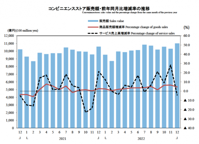 その結果、2022年のコンビニエンスストアの商品販売額とサービス売上高は、12兆1996億円となり、前年比3.8%の増加となった。