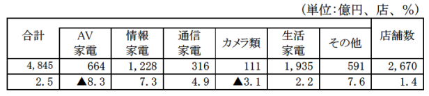 カテゴリー別では、その他が7.6%増、情報家電が7.3%増、通信家電が4.9%増、生活家電が2.2%増。一方で、AV家電が8.3%減、カメラ類が3.1%減となった。