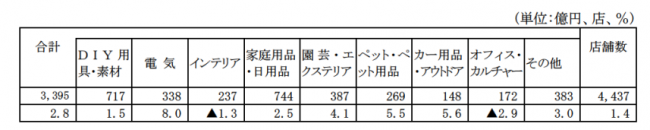 カテゴリー別にみると、電気が8.0%増、カー用品・アウトドアが5.6%増、ペット・ペット用品が5.5%増、園芸・エクステリアが4.1%増、その他が3.0%増、家庭用品・日用品が2.5%増、DIY用具・素材が1.5%増。一方で、オフィス・カルチャーが2.9%減、インテリアが1.3%減となった。