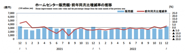 12月ホームセンター統計|3395億円2.8%増/2022年販売額は3兆3419億円