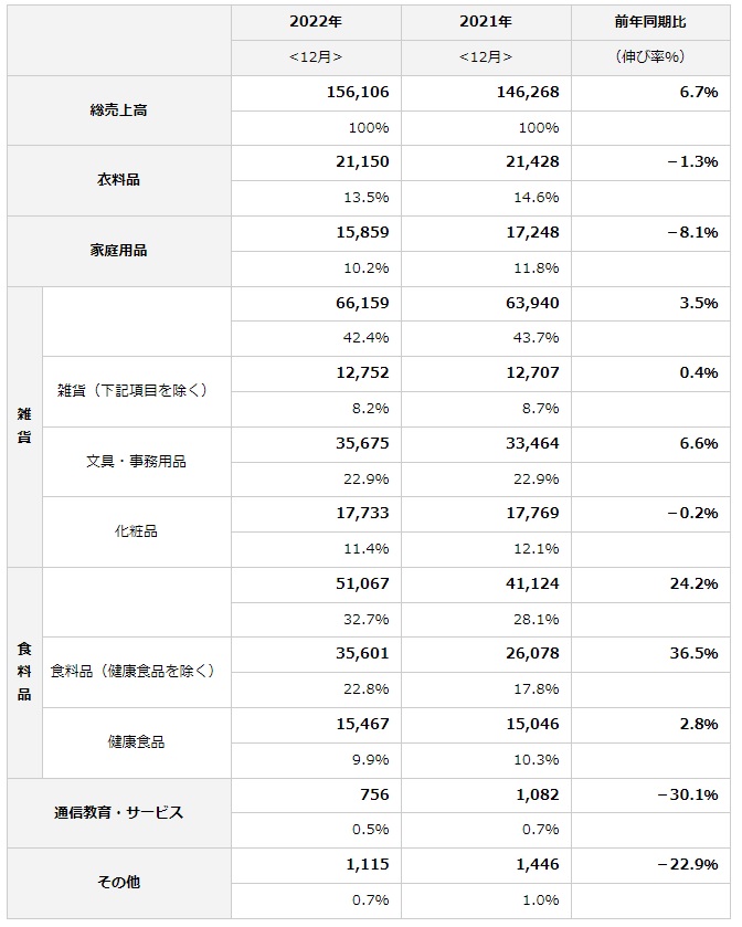 商品別では、「食料品」が510億6700万円で24.2%増と、大幅に伸長した。「衣料品」が211億5000万円で1.3%減、「家庭用品」が158億5900万円で8.1%減、「雑貨」が661億5900万円で3.5%増、「通信教育・サービス」が7億5600万円で30.1%減、「その他」が11億1500年で22.9%減となった。