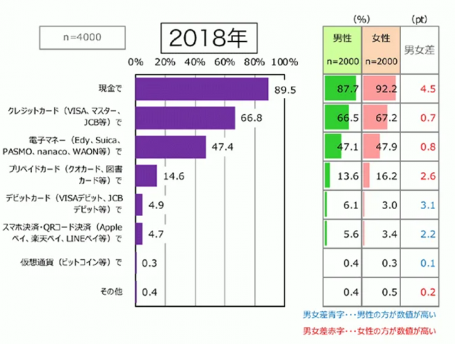 2018年から19年にかけてスマホ決済サービスが続々と誕生したが、約4年という短い期間で確固たる地位を築いていることが明らかになった。2018年の調査と今回の調査における共通点としては、「デビットカード(VISAデビット、JCBデビット等)で」と回答した人は、どちらも男性のほうが高い割合となっている。