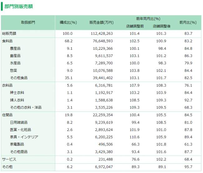 会員企業数56社、店舗数1万0680店の調査で、前月より3店舗減。総販売額は1兆1242億8263万円で、既存店前年同月比は101.3%、全店では101.4%と前年を上回った。