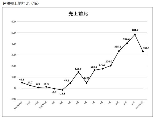 1月の免税総売上高は約193億6000万円で、前年同月比331.5%増。売上高の内訳は「一般物品」が約174億円で330.9%増、「消耗品」が約19億6000万円で336.7%増となった。