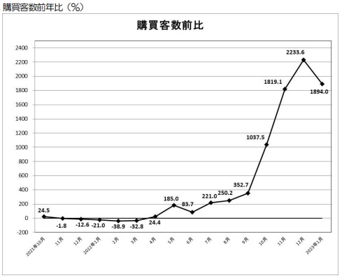 (一社)日本百貨店協会(東京都中央区、村田善郎会長)のインバウンド推進委員会が、2023年1月の「外国人観光客の売上高・来店動向」を発表した。インバウンド推進委員店の88店舗が調査対象。