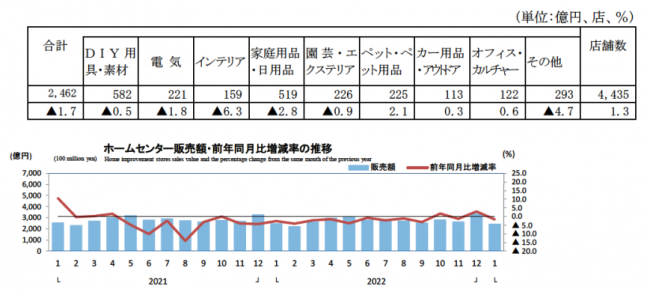 それによれば1月のホームセンター販売額は2462億円、前年同月比1.7%減だった。店舗数は4435店で前年比1.3%の伸長。