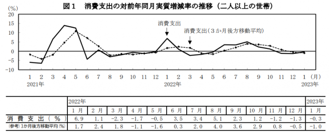 1月家計調査|2人以上世帯消費支出は30.2万円0.3%減/実収入1.7%減