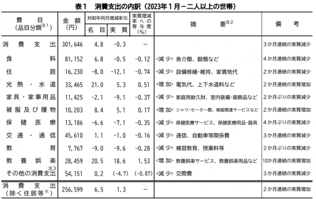 総務省統計局発表の1月の「家計調査報告」によれば、2人以上の世帯の消費支出は30万1646円で、前年同月比は物価変動の影響を除いた実質では0.3%の減少、名目4.8%の増加となった。前月比(季節調整値) は実質2.7%の増加だった。