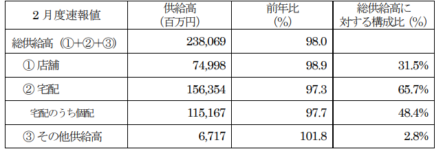 2月日生協統計|総供給高2.0%減/5カ月ぶりに前年割れ