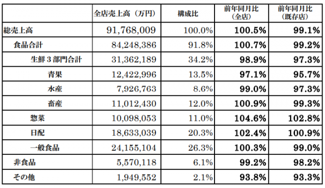 総売上高は9176億8009万円で既存店前年同月比は99.1%、全店では100.5%だった。