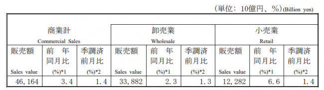 なお、商業販売額の季節調整済(季節、曜日・祝祭日・月の長さの要因を調整したもの)前月比は1.4%の上昇、卸売業は1.3%の上昇、小売業は1.4%の上昇だった。