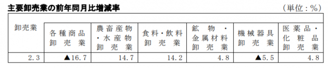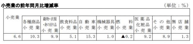 小売業を業種別にみると、自動車小売業が前年同月比15.3%増、各種商品小売業(百貨店など)が10.3%増、織物・衣服・身の回り品小売業が9.9%増、医薬品・化粧品小売業が9.2%増、その他小売業が8.9%増、飲食料品小売業が5.1%増、無店舗小売業が1.3%増、機械器具小売業が1.0%増、一方で、燃料小売業が0.2%減となった。