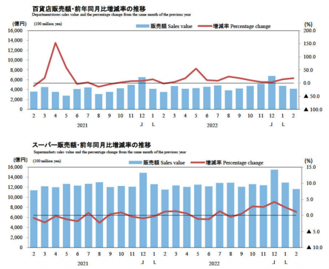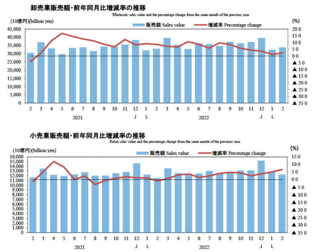 2月商業動態統計|商業販売額46.2兆円3.4%増/小売業販売額12.3兆円