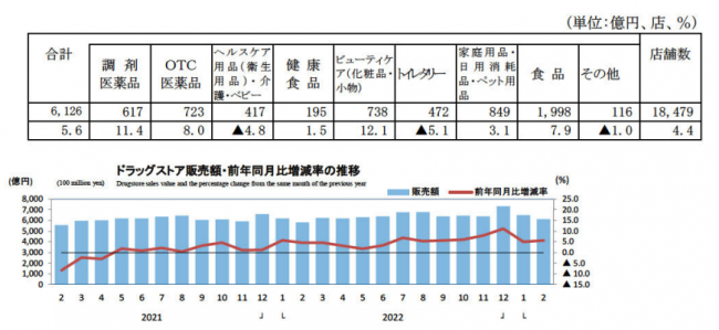 商業動態統計によれば2月のドラッグストア販売額は6126億円、前年同月比5.6%増。店舗数は1万8479店と前年同月比4.4%の増加だ。商品別にみると、ビューティケア(化粧・小物)が前年同月比12.1%増、調剤医薬品が11.4%増、OTC医薬品が8.0%増、食品が7.9%増、家庭用品・日用消耗品・ペット用品が3.1%増、健康食品が1.5%増、一方で、トイレタリーが5.1%減、ヘルスケア用品(衛生用品)・介護・ベビーが4.8%減、その他が1.0%減だった。