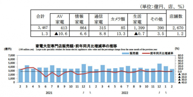 経済産業省の「商業動態統計速報」による家電大型専門店の2月の販売額は3467億円で、前年同月比1.3%増だった。店舗数は前年比1.2%増の2670店。
