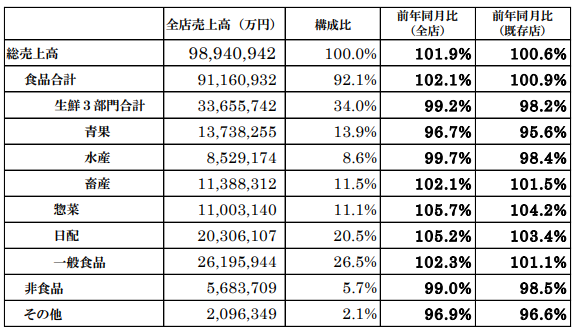食品合計は9116億0392万円で既存店100.9%、全店では102.1%。生鮮3部門合計は、3365億5742万円で既存店98.2%、全店では99.2%だった。