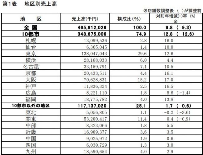 地区別では、都市(10都市/18カ月連続)が、インバウンド効果などから全地区で前年をクリアし、12.8%増と二桁の伸びを示した。地方(10都市以外の7地区)も6地区でプラスとなり、1.7%増と3カ月連続で前年実績を超えた。