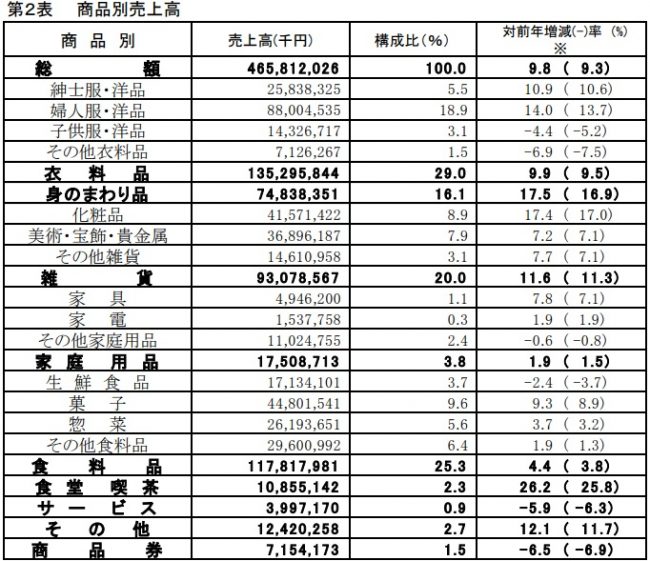 食料品は、催事効果や行楽需要のほか、手土産需要もあり、菓子と惣菜は共に19カ月連続増となった。