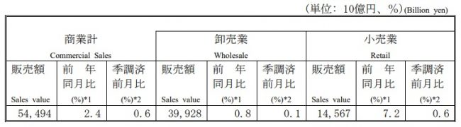 なお、商業販売額の季節調整済(季節、曜日・祝祭日・月の長さの要因を調整したもの)前月比は0.6%の上昇、卸売業は0.1%の上昇、小売業は0.6%の上昇だった。