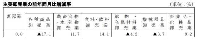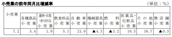 小売業を業種別にみると、自動車小売業が前年同月比21.0%増、その他小売業が16.7%増、医薬品・化粧品小売業が10.3%増、各種商品小売業(百貨店など)が5.4%増、飲食料品小売業が5.1%増、織物・衣服・身の回り品小売業が1.9%増となった。一方で、機械器具小売業が4.3%減、燃料小売業が3.2%減、無店舗小売業が0.3%減となった。