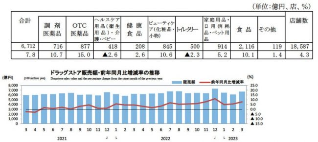 商業動態統計によれば3月のドラッグストア販売額は6712億円、前年同月比7.8%増。店舗数は1万8587店と前年同月比4.3%の増加だ。