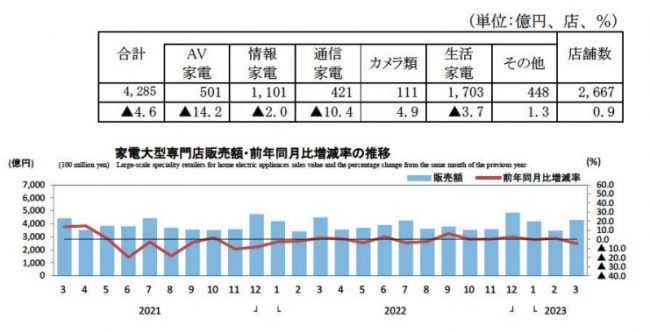 経済産業省の「商業動態統計速報」による家電大型専門店の3月の販売額は4285億円で、前年同月比4.6%減だった。店舗数は前年比0.9%増の2667店。