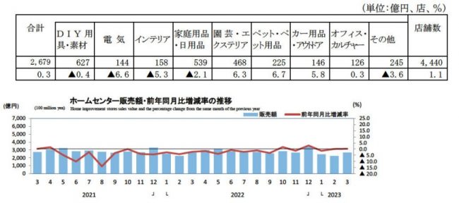 それによれば3月のホームセンター販売額は2679億円、前年同月比0.3%増だった。店舗数は4440店で前年比1.1%の伸長。
