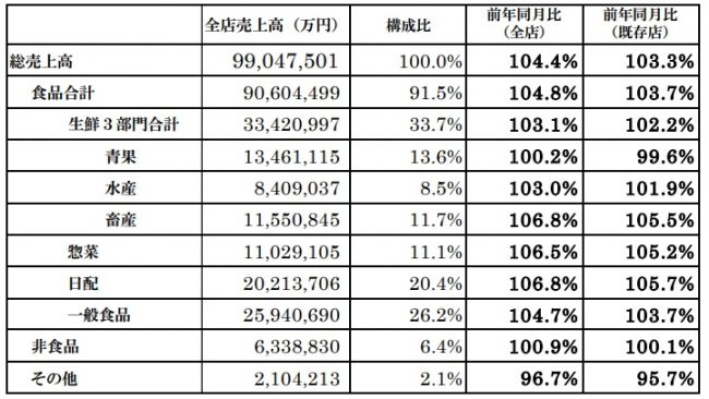 総売上高は9904億7501万円で既存店前年同月比は103.3%、全店では104.4%だった。