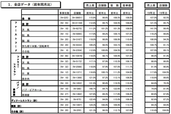4月外食統計|全体売上げは前年同月比115.8%・19年比107.0%