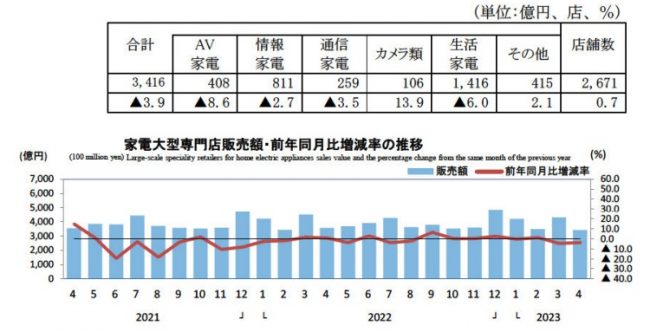 経済産業省の「商業動態統計速報」による家電大型専門店の4月の販売額は3416億円で、前年同月比3.9%減だった。店舗数は前年比0.7%増の2671店。