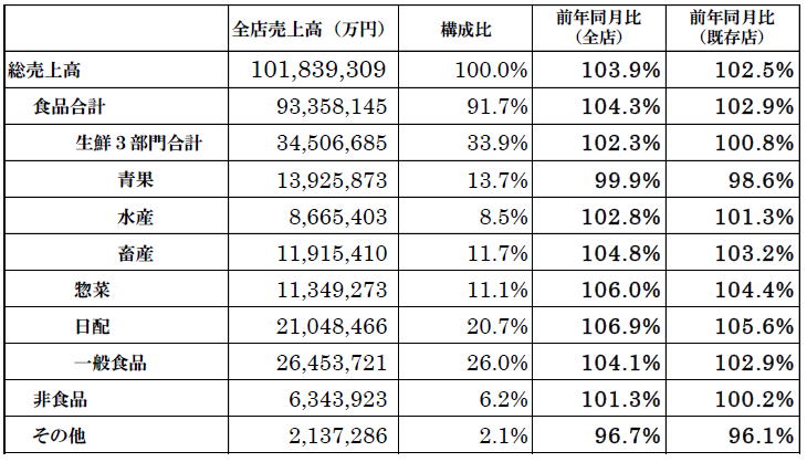 食品合計は9335億8145万円で既存店102.9%。生鮮3部門合計は、3450億6685万円で100.8%だった。