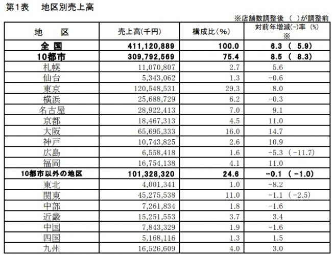 地区別では、インバウンド効果や株高などから、都市(10都市/8.5%増)が7地区で前年実績をクリアし20カ月連続プラスとなった。一方で地方(10都市以外の7地区)は0.1%減と僅かに前年実績に届かず、5カ月ぶりにマイナスに転じた。
