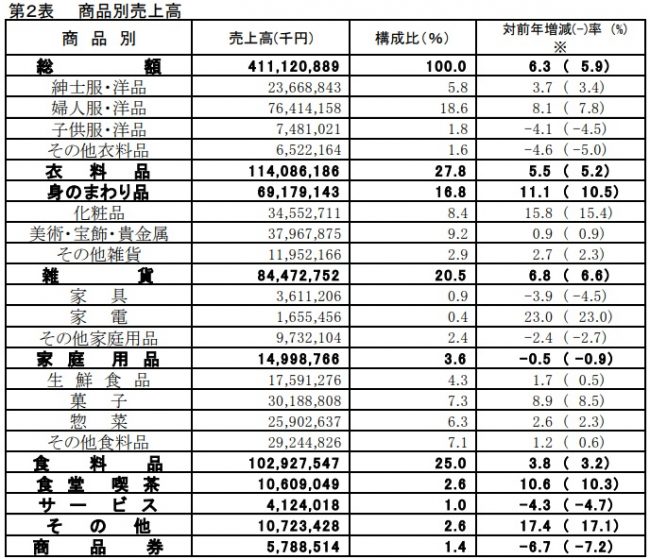 商品別では、主要5品目のうち4品目で前年実績を超えた。なかでも、身のまわり品は11.1%増で二桁の伸びとなった、ラグジュアリーブランドを中心に、バッグや財布、靴が好調だった。
