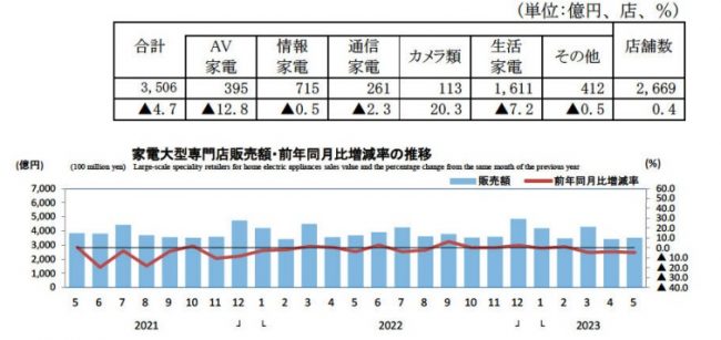 経済産業省の「商業動態統計速報」による家電大型専門店の5月の販売額は3506億円で、前年同月比4.7%減だった。店舗数は前年比0.4%増の2669店。
